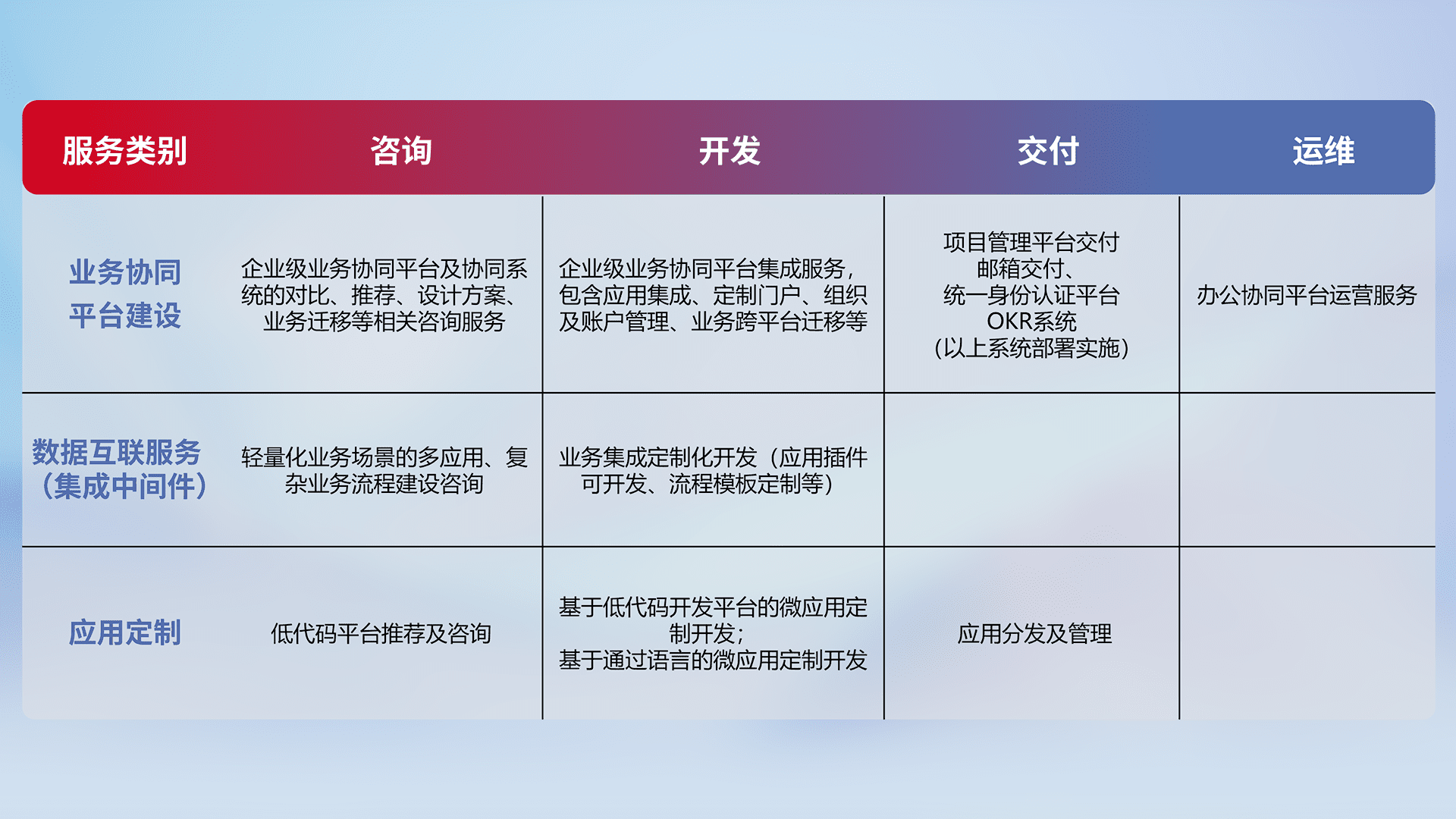 针对钉钉、、、、企微、、IDaas等平台级产品提供产品的规划、、、、方案、、、交付、、、、定制化开发等服务,,实现如统一协同办公、、、智能客户服务、、、混合会议管理、、、、智能数据查询、、、等业务场景,,,实现数字化转型。。。