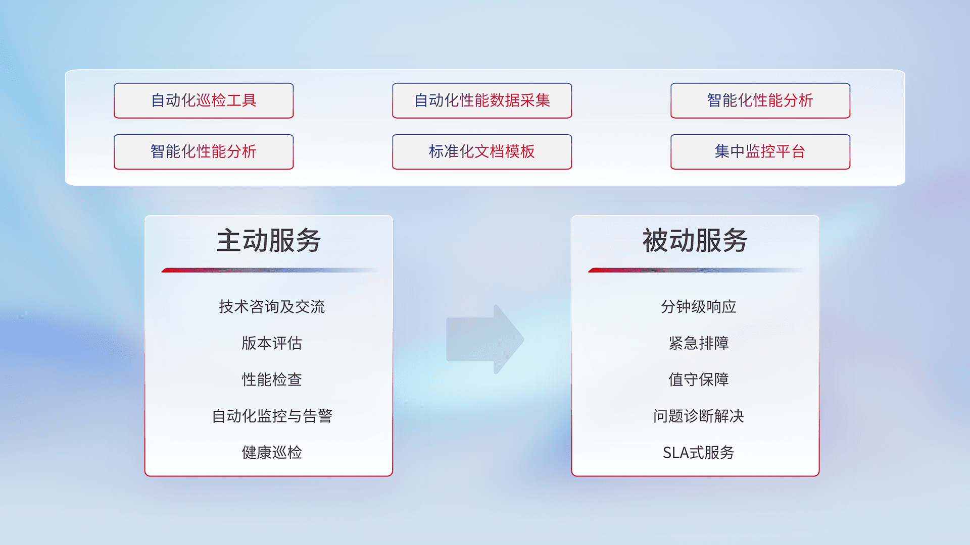 智能化工具和标准化文档,,保障服务质量,,,提供主动服务(包含技术咨询、、版本评估、、性能检查、、自动化监控与告警、、、、健康巡检)和被动服务包含(分钟级响应、、、紧急排障、、、值守保障、、、问题诊断解决、、SLA服务)。。。