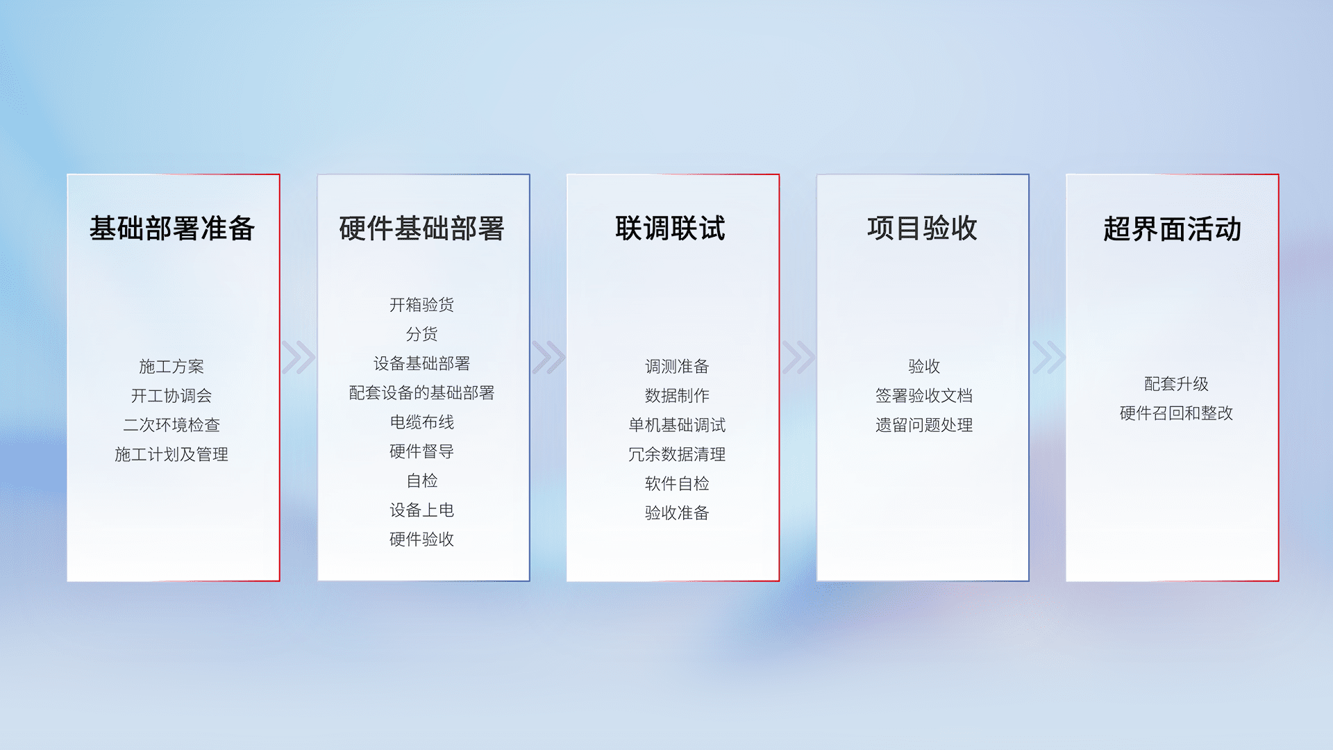 从基础部署准备、、、、硬件基础部署、、、、联调联试、、项目验收、、、越界面活动的全过程可追溯,,,,保证施工质量和进度。。